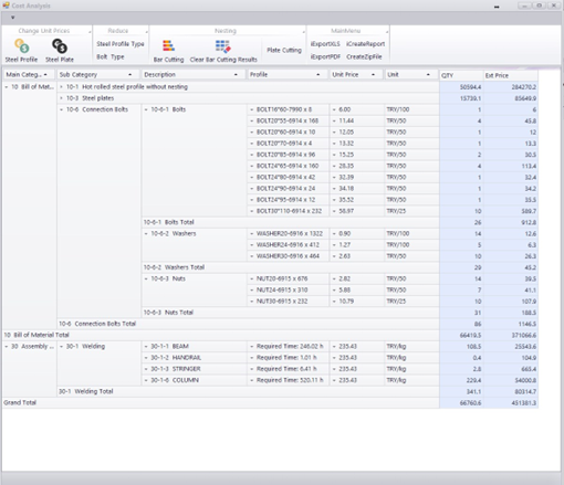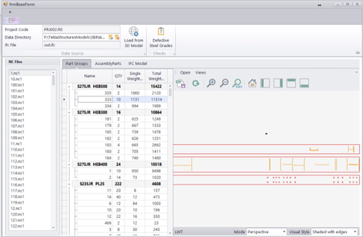 Tekil parçaların adetleri ve çelik kaliteleri aşağıdaki formda gösterilmiştir. Sağdaki çizim ekranında CNC makinalar ile çelik profil/levhaları işlemek için kullanılan DSTV-NC dosyasından elde edilen çizim verilmiştir. Bu özellik ileriki bölümlerde anlatılacak kesim planı yaparken ek yerlerinin karar verilmesinde çok işe yaramaktadır.