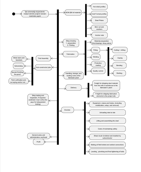 Çelik yapı imalatı yapan bir fabrikanın, bir çelik yapının üretime başlamadan önce kendisini zarar uğratmayacak maliyeti hesaplayabilmesi gerekir. Maliyet analiz için çoğu zaman yeterli süre yoktur. Bizim amacımız detaylı tasarım yazılımlarından (Tekla Structures, vb) elde ettiğimiz NC ve IFC dosyasını ve yukarıda belirtilen süreçleri takip ederken edindiğimiz bilgileri kullanarak gerçekleşmesi en muhtemel üretim maliyetini hesaplamaktır. Malzeme maliyetlerini hesaplarken optimizasyon algoritmalarımız en büyük yardımcımız olacaktır. Bu amaçla “teklif hazırlama” modülü geliştirilirken aşağıda göstermeye çalıştığımız malzeme ve işçilik giderlerinin dikkate alınır.