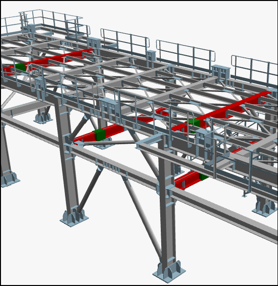 Aşağıda daha detaylı olarak verilen çizimde eklerin yeri yeşil renki dikdörgen prizmalar ile kullanıcıya gösterilmektedir. Ek yerleri belirlenirken CNC profil kesme makinalarının kullanacağı DSTV-NC dosyalarının içeriği okunmuş, cıvata delik bilgisine ulaşılarak yasaklı bölgeler tesbit edilmiştir. Bizim ek yapabilen kesim algoritmamız bu bilgiyi kullanarak ek yerine karar vermektedir.