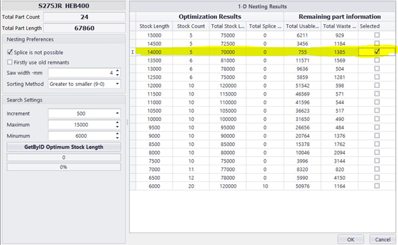 Yukarıdaki kullanıcı arayüzü ile 6000 mm ile 15000 mm arasında ek yapmanın mümkün olmadığı stok boyları için araştırma yapılmış ve en uygun seçeneğin 14000 mm olduğuna karar verilmiştir.