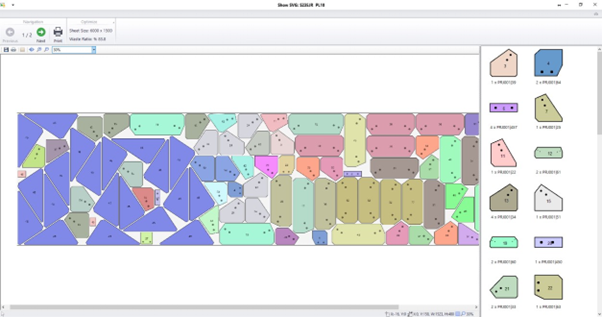 Çelik levhaların belli ölçülerdeki plaka içine yerleştirmekte Fransız-Alma firmasının Powernest kütüphanesi kullanılmıştır. Bu kütüphanenin C++ dilinde yazılımış, Mergen C# ile geliştiriliyor olması proje süresinin uzamasının sebeplerinden biridir. Fakat projenin 2D optimizasyon yapabilmesi elimizi çok güçlendirmiştir. Yukarıdaki yerleşim planına bakıldığında bazı parçaların döndürülmesi bazılarının aynalanması ile çok iyi sonuç elde edilmiştir. Bu kullanılan kütüphane seçiminin ne derece başarılı olduğunu göstermektedir.